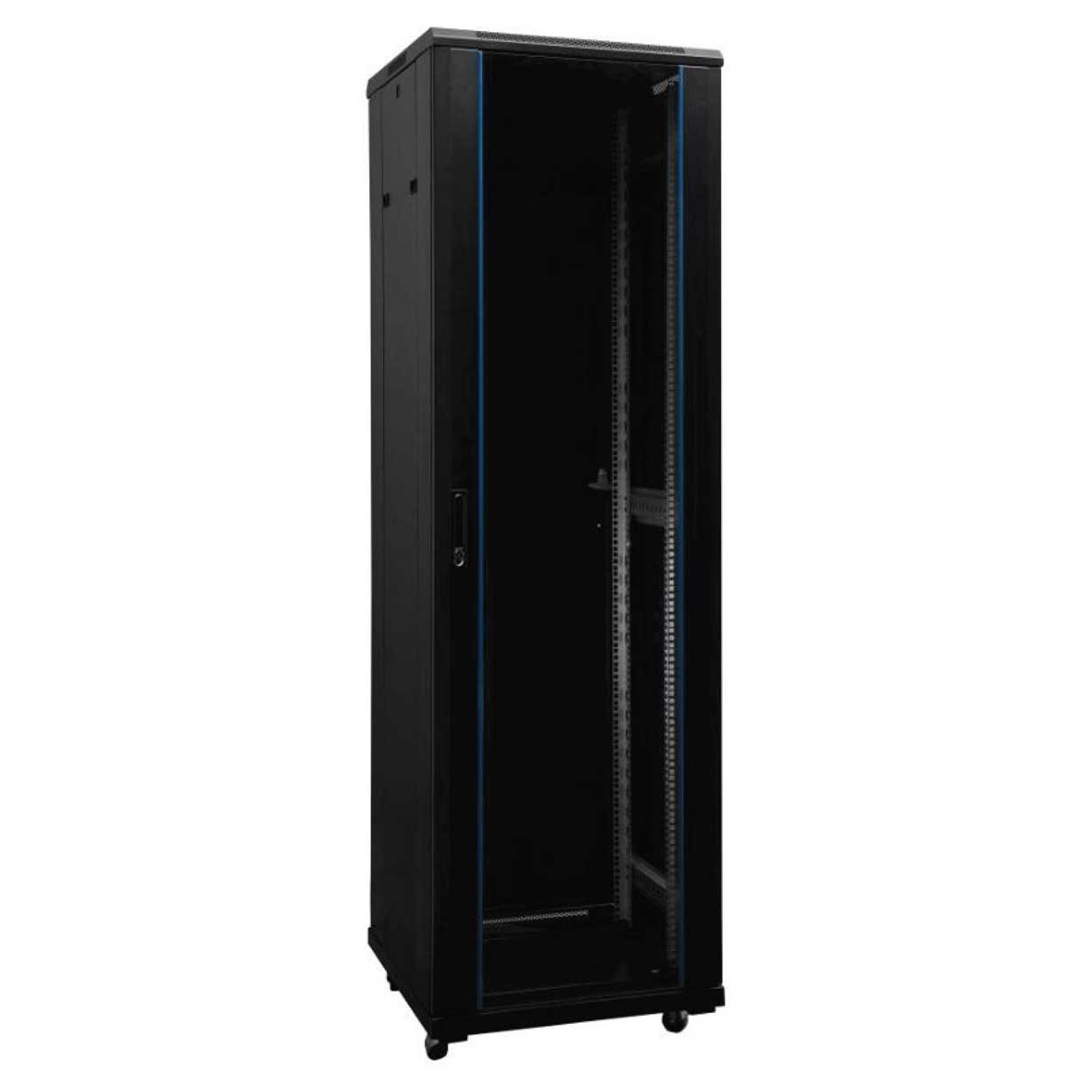 Rack cabinet with toughened glass front door and steel rear door, designed for standard installations. Features removable side panels, adjustable feet, heavy-duty castors, and multiple lockable cable entries for easy access and maintenance. Supplied in assembled frame structure with optional accessories and customizable sizes to meet various requirements. advanced UK production and packaging technology